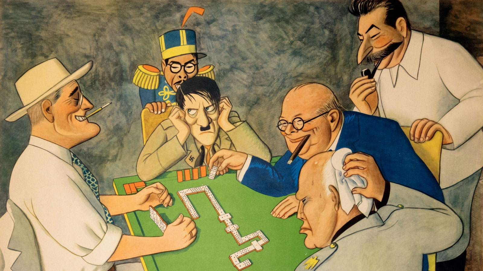 Compare this to a recent drawing by cartoonist Mike Luckovich. Here, President Donald Trump is shown hiding under his desk as anti-racism and police brutality protesters gather outside the White House. The cartoon portrays Trump cowering in fear, much as Massaguer's Hitler and Mussolini are depicted as scared of losing to Roosevelt and Churchill in the game of dominoes.