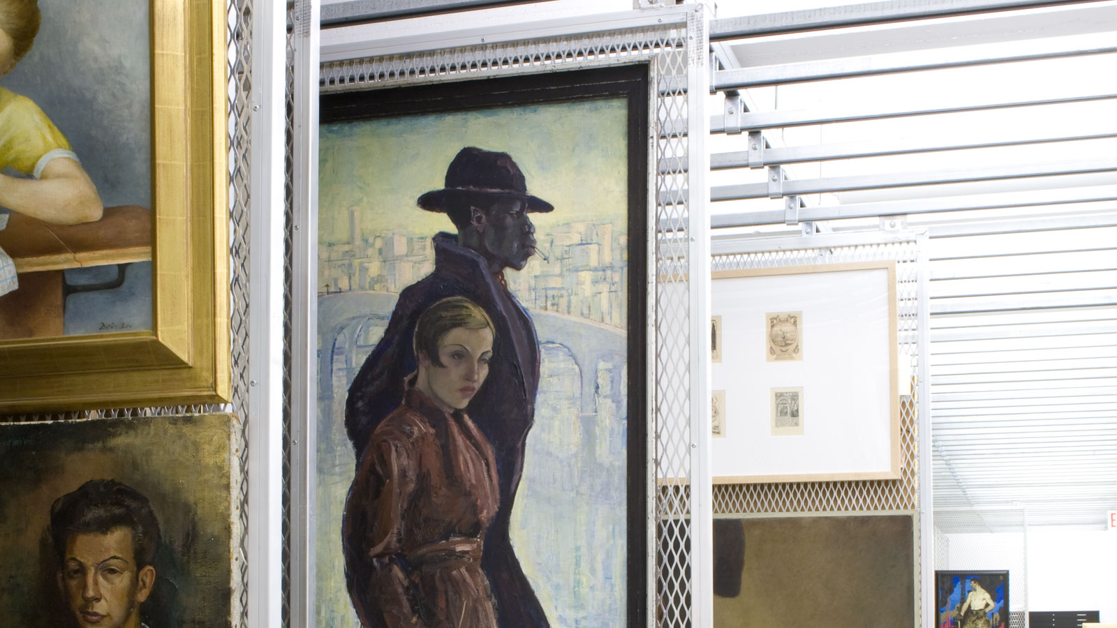 Miss X is one of several portraits in the Wolfsonian collection by African-American painter and printmaker Dox Thrash. The enigmatic female face is generally identified with Edna McAllister, Thrash's future wife, and could be the counterpart of Mr. X, an earlier self-portrait by the artist. Edna, a dressmaker in Philadelphia, was introduced to Thrash by his lifelong friend, African-American painter Samuel Brown (1907–1994), whose portrayal, Samuel, is also documented in our collection. Thrash's distinctive portrait heads delineate images of individuals proudly affirming their Black identity. The frontal depiction of Miss X captures the dignified bearing of the woman with her elongated neck and her sculptural features, while Samuel is represented looking down in a meditative pose. Thrash used a particular printing technique, the so-called carborundum mezzotint, that allowed him to surround his subjects with a dramatic aura of light and shade. He elaborated this new printing process in 1937 with fellow WPA artists Hubert Mesibov and Michael Gallagher at the Fine Print Workshop of the Works Progress Administration Federal Art Project in Philadelphia. Using a carbon-based abrasive on copper plates, Thrash created a print image that allowed a broader tonal variation and a richer chiaroscuro, as seen in these two portraits.