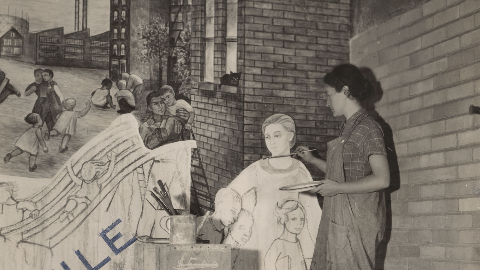 Bloch got a commission to paint a mural in the 12th-floor recreation room through the Federal Arts Project (FAP), a New Deal agency that offered work to struggling artists. She wanted not only to brighten the room, but—in the spirit of rehabilitation—to provide encouragement to the confined women by showing them a picture of what their lives might be like after their release. The plan was to create frescoes for three walls of the room, collectively titled The Cycle of a Woman's Life. She managed to complete only one wall, a scene of women and children enjoying themselves on a New York playground.