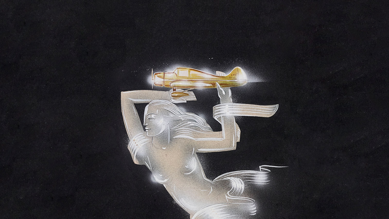 During his visit, Schrekengost donated two proposal drawings for the trophy that provide important details, one clearly depicting a small detachable airplane to be held in the hands of the female figure that was intended to serve as the annual keepsake award. While this element was missing from The Wolfsonian's trophy at the time of its purchase and remains lost, hope remains that it will reappear in the future when someone realizes the connection.