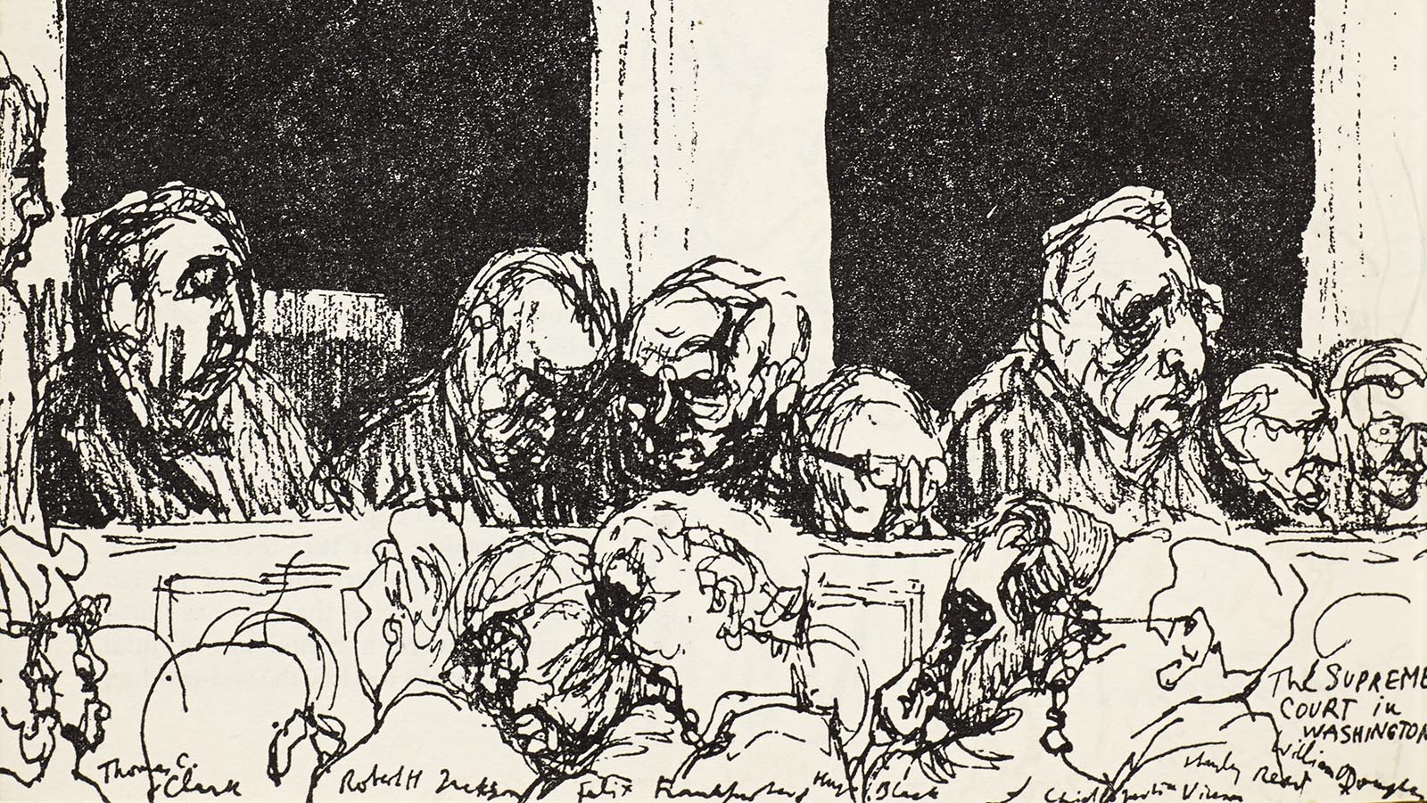 The settings pictured are quite ordinary, as the scenes are rooted in everyday experiences. I find that these fleeting moments in time are the true backbone of history, since they can reveal a lot more about daily life than meets the eye. In illustrations showing a neighborhood in Harlem, New York, and in another depicting the interior of a criminal court in London known as "the Old Bailey," clothing, hairstyles, and environment provide clues about the social, cultural, and economic dynamics of the time. The busy Harlem neighborhood, with casually dressed pedestrians of different races, displays the cultural melting pot that was New York in the 1950s. The Englishmen wearing powdered wigs and formal robes in the courtroom evoke a legal system bound to tradition—the visual representation of which conflicted with public narratives of societal shifts and modernization in the mid-20th-century British Commonwealth.